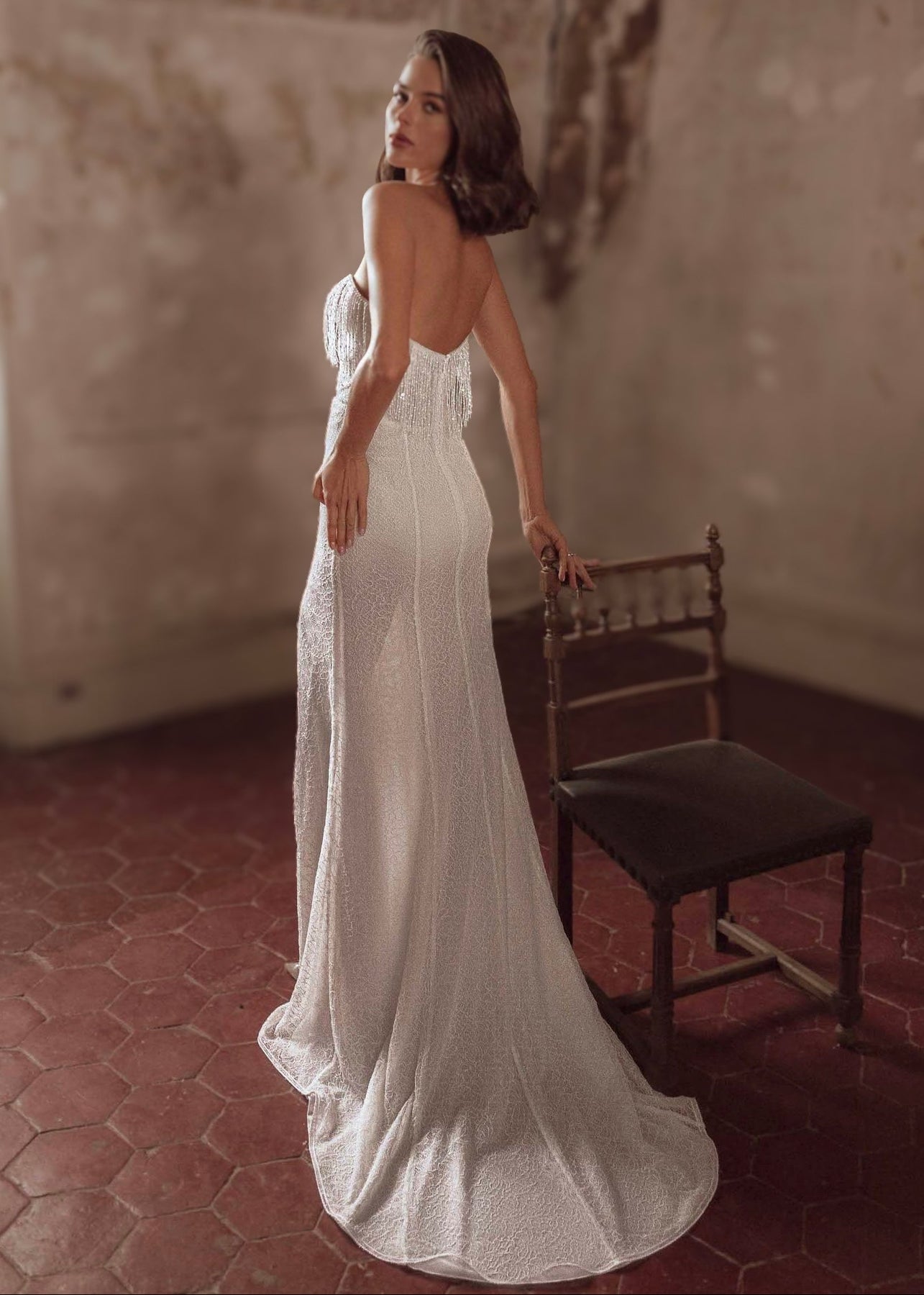 The Ines dress is a strapless mermaid stunner, crafted from guipure lace and fully lined for a flawless fit. The sweetheart neckline? Next-level gorgeous with fringe and shimmering sequins. And that spicy little leg slit with a trailing sweep train? Total red carpet energy.
