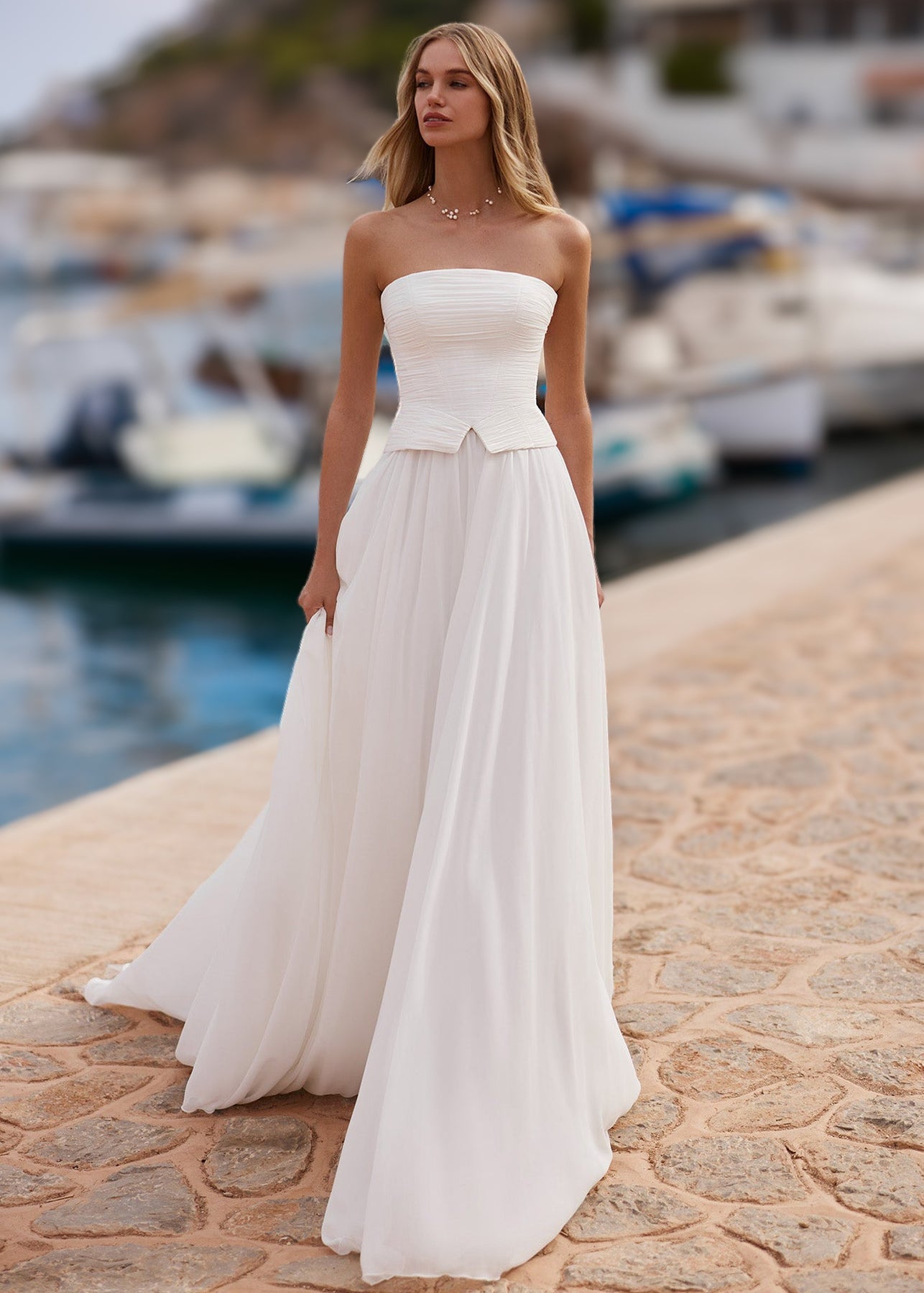 Lotti pairs a structured, pleated bodice with a floaty chiffon A-line skirt — giving you shape up top and effortless movement below. The strapless neckline and V-notch waist keep it modern, while the lace-up back lets you tweak the fit to perfection. Oh, and yes — it has a train!