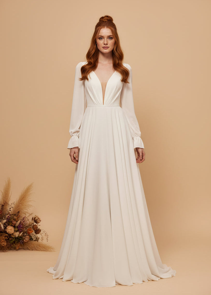 Meet Millie — clean, modern, and effortlessly cool. With a deep V neckline, light unlined sleeves, and that killer open v-back, she’s proof that simple doesn’t mean boring. The flow of the skirt gives you movement without fuss, and the whole look is understated in the best possible way. For the bride who wants to feel confident, comfortable, and completely herself.