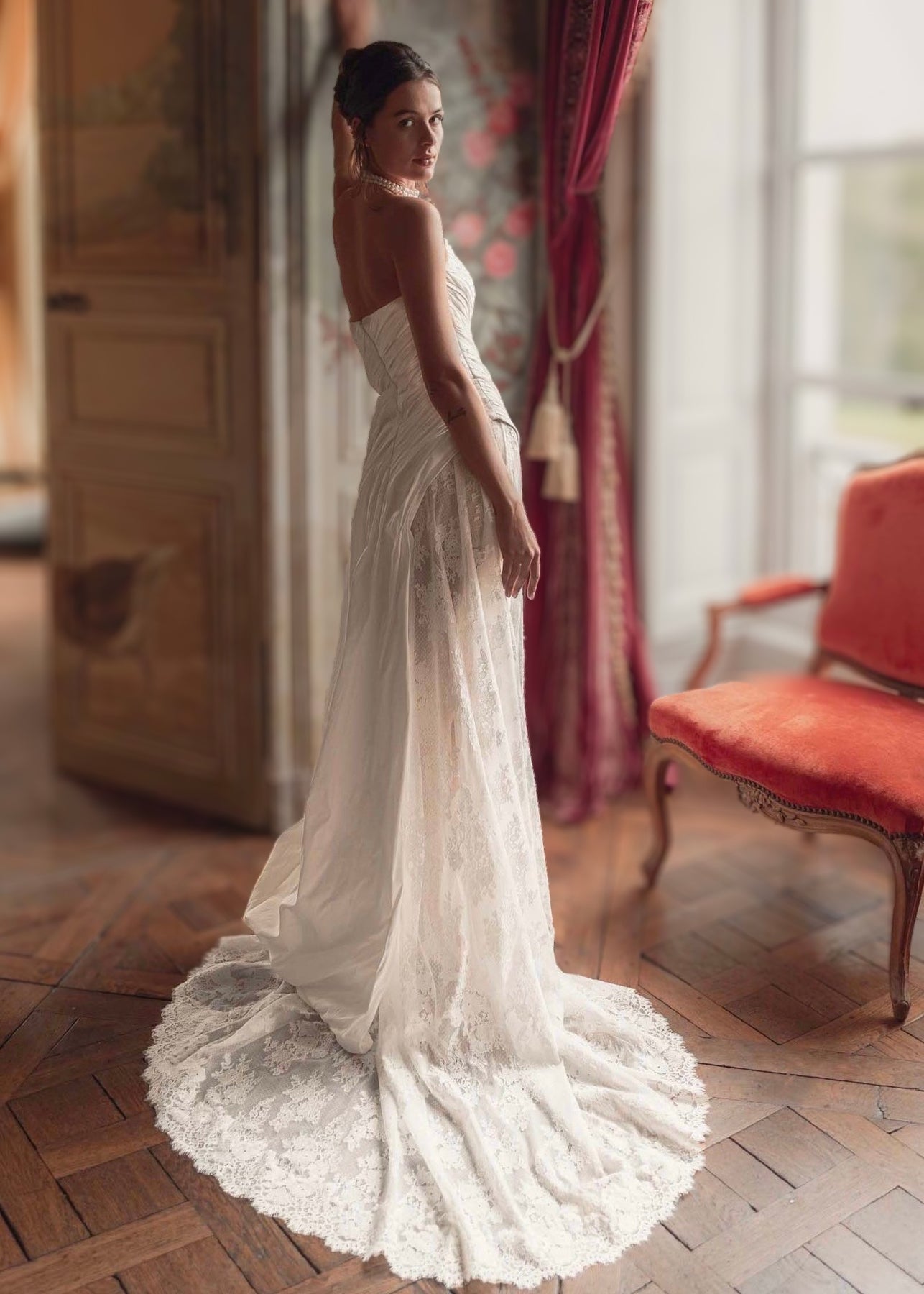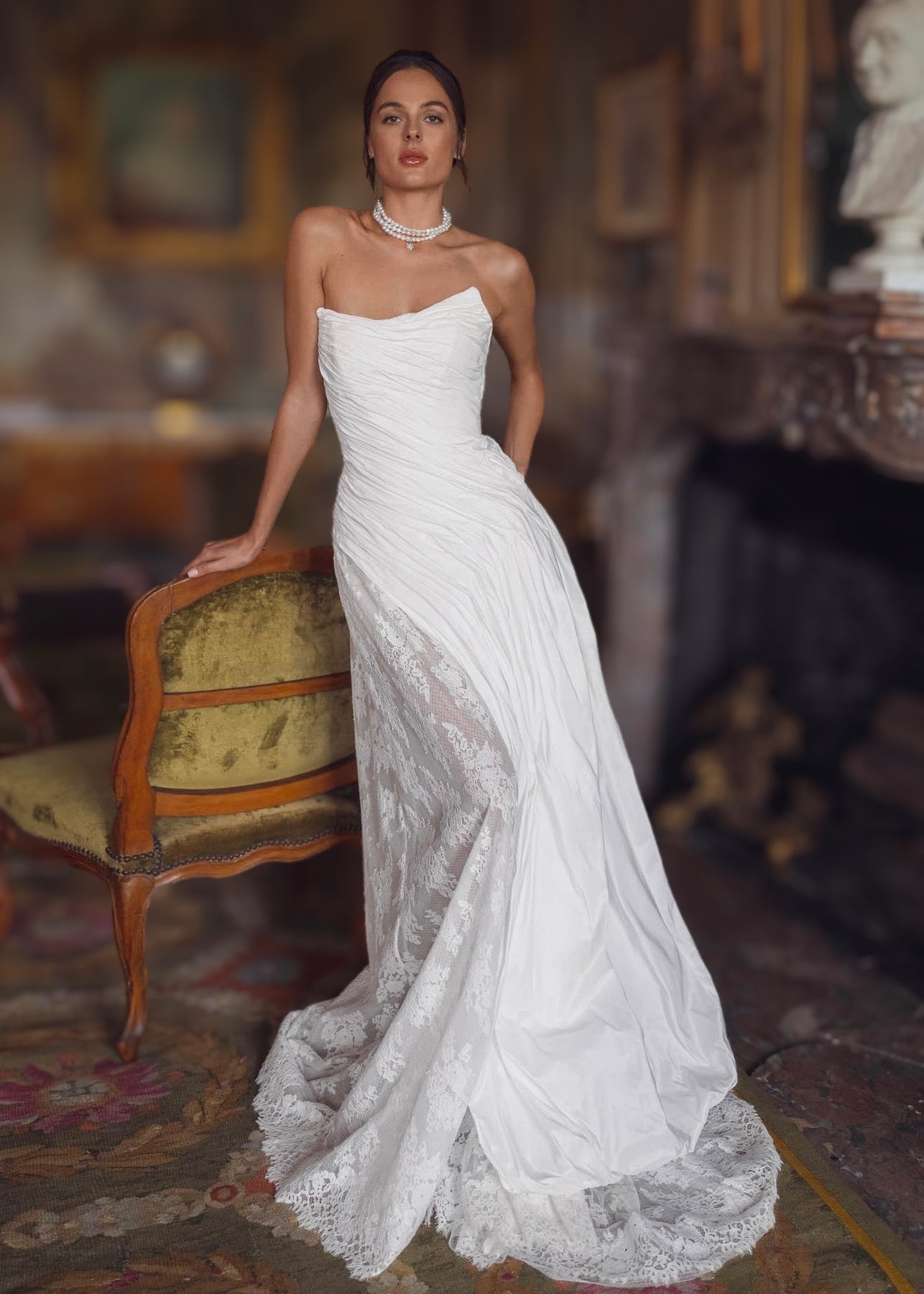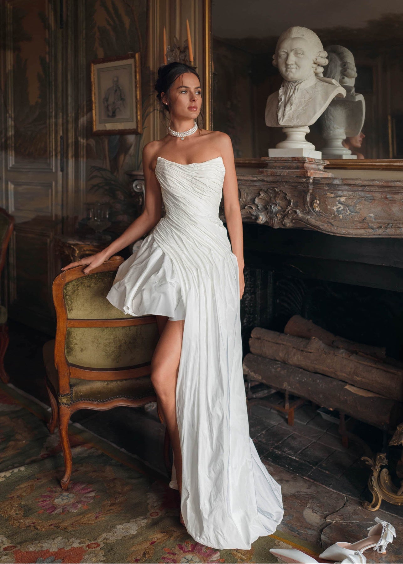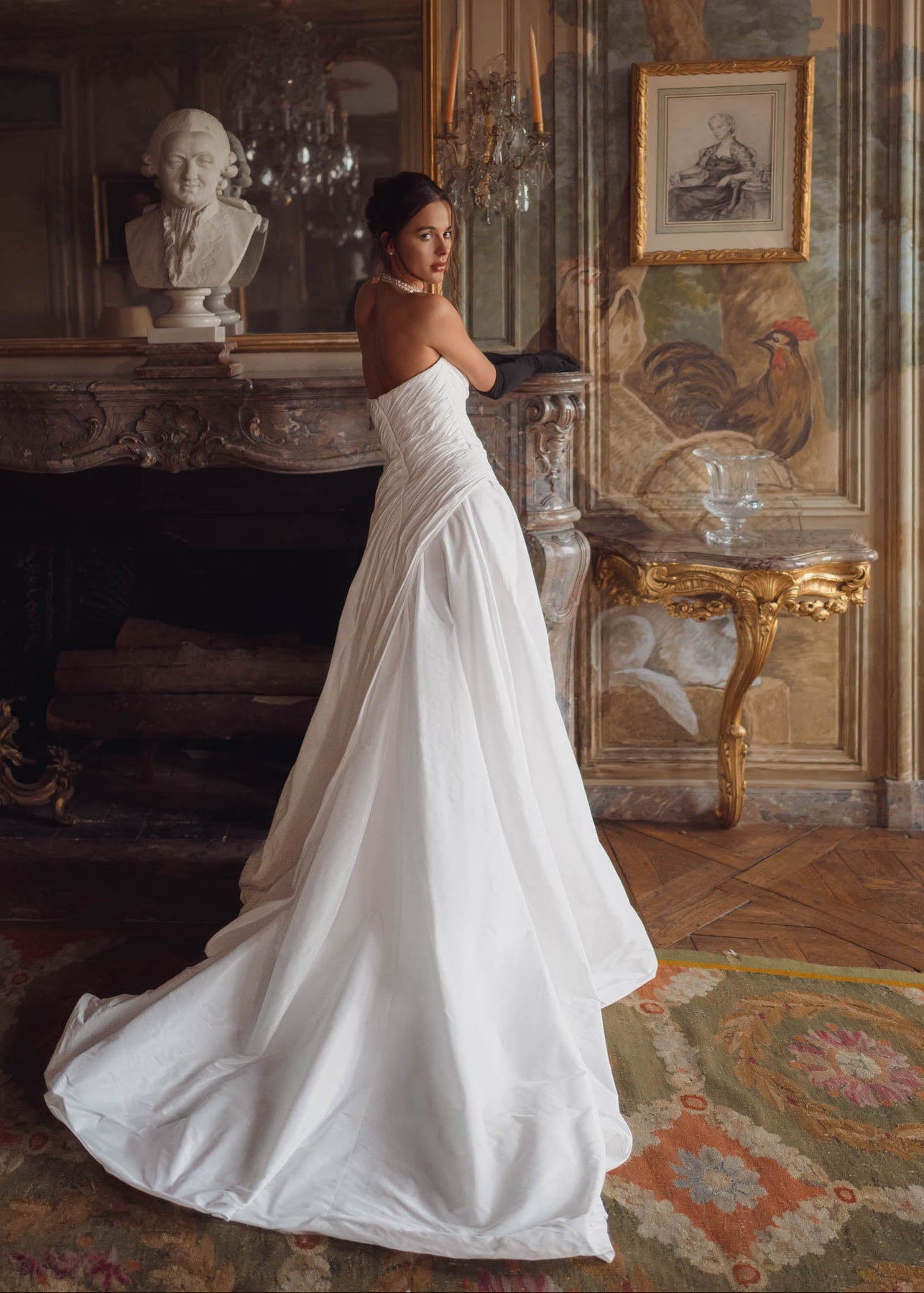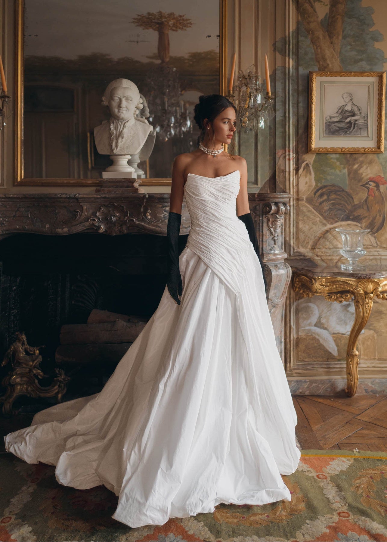 Tery is a strapless, structured bodice crafted in luxe taffeta with a moon-shaped neckline and diagonal draping that gives a sculpted, almost 'marble-veil' texture. Clean, modern, and a little unexpected — and with three different skirt options to choose from, you can build the look that feels most “you.”