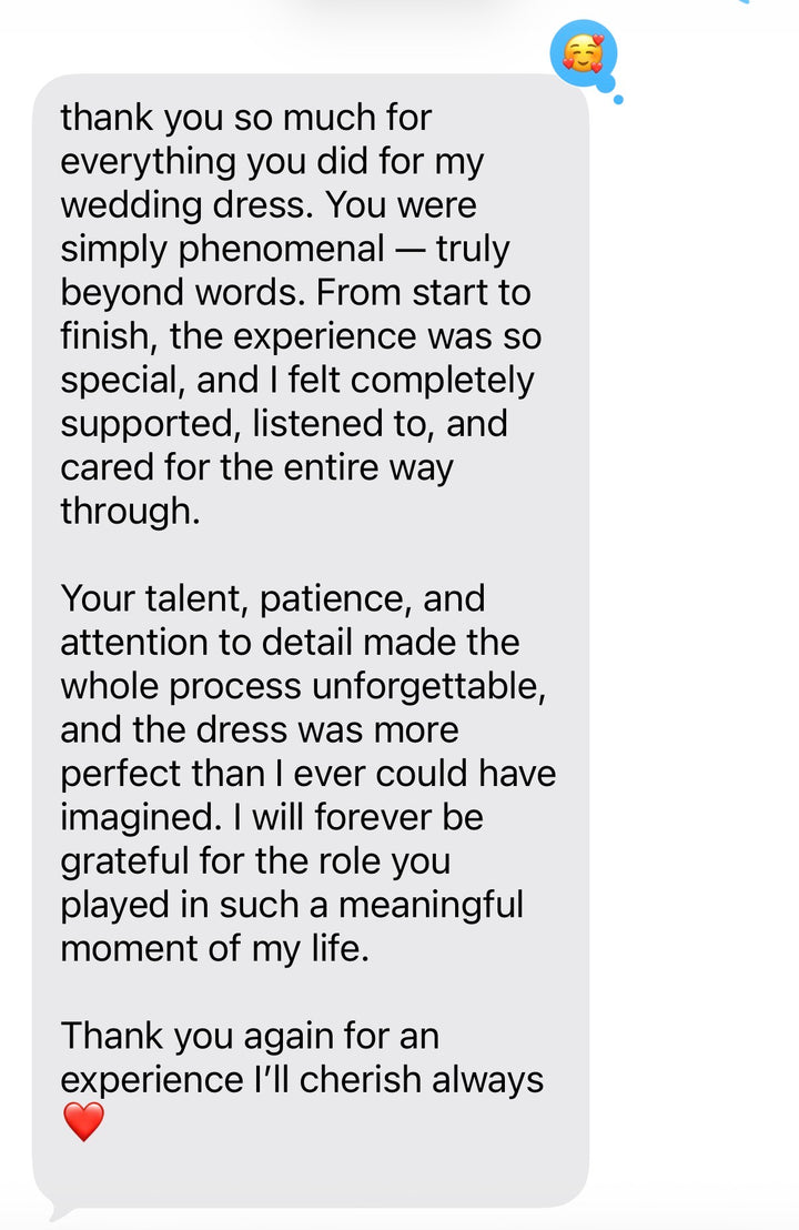 I was so so blessed by her care and effort that she put into every aspect of me getting my dress. She's is so talented and am certain still I snagged the most beautiful wedding dress ever. Such a fantastic experience and would/have highly recommended her to anyone that is looking for a wedding dress!!"Abbie K
